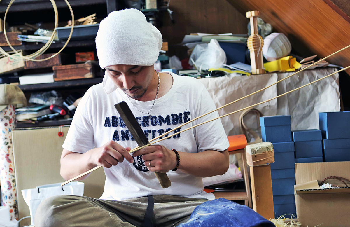 兄が材料となる竹を作り、弟がその材料を組合せて土台をつくり、父が仕上げの絵付けを行う。