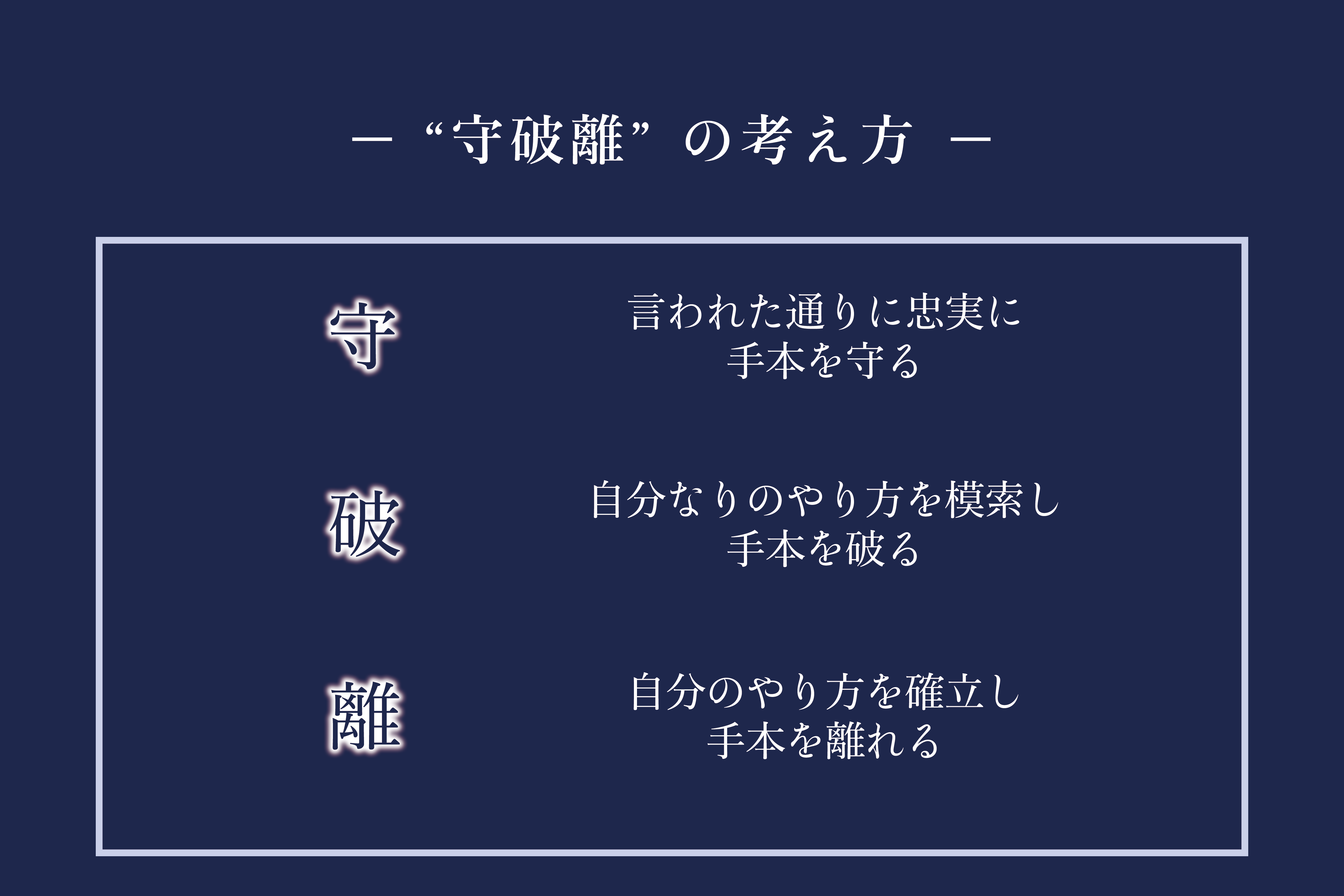 まずは言われたことを守って手本通りやる。次に、自分なりにやってみようということで“破る”。自分なりの試行錯誤は大事です。やったらあかんと言われたこともやってみないとわかりません。やったら発見もあります。