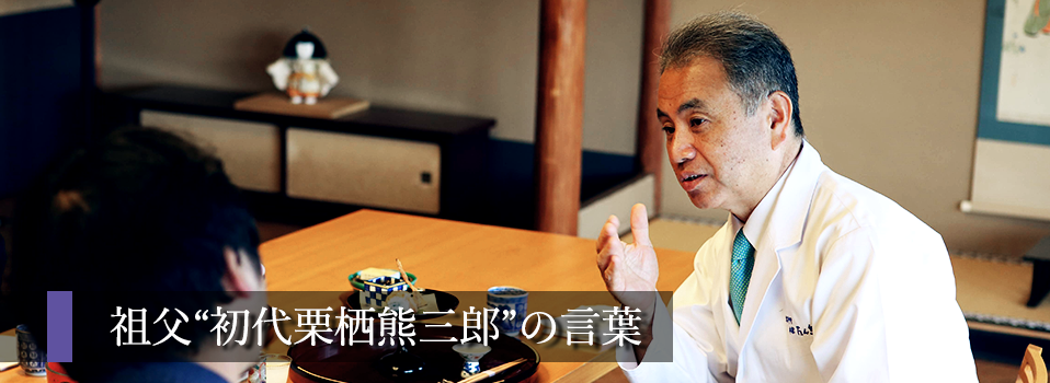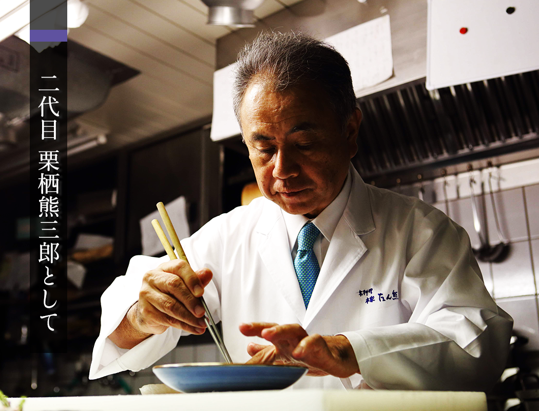 私は二十歳の時に祖父の後を継ぎ、平成元年に店の名前を“本家たん熊”に、そして私が京料理の修業を始めて17年経った平成3年、37歳の時に改名して戸籍から『栗栖熊三郎』の名前を襲名しました。」