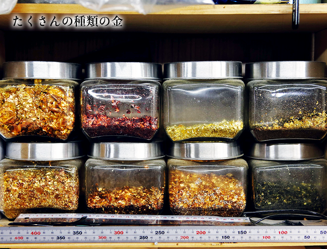『金は糊付いたらなんでも貼れるから、何でもできるんや』って思ってから普通の金彩屋さんに依頼してもできひんもんでもやるんです。嫌っていうのはいややしね。貼れるもんやったらなんでもやります。ガラスにも貼れるし、金属でも木でもなんでもやります。